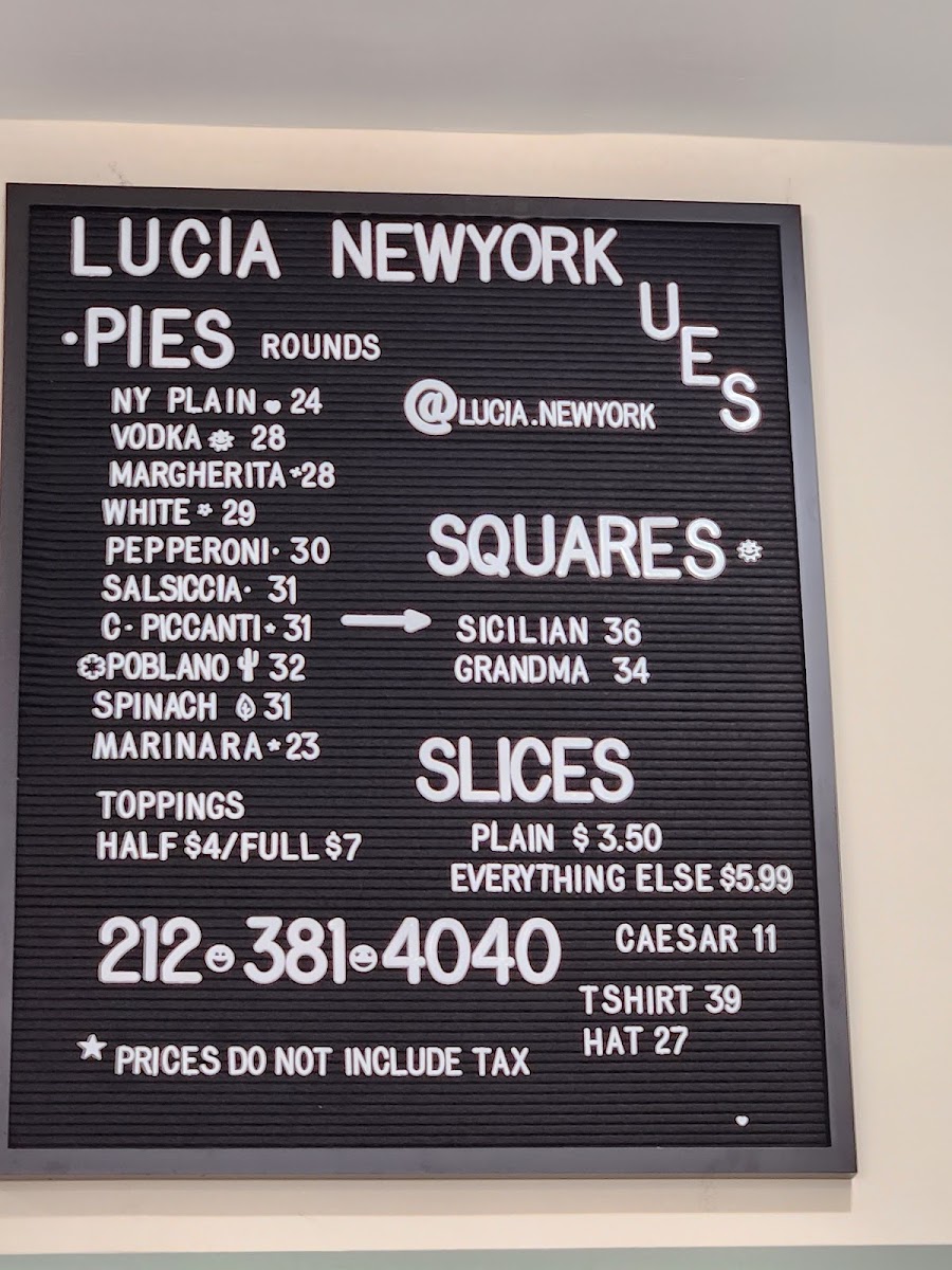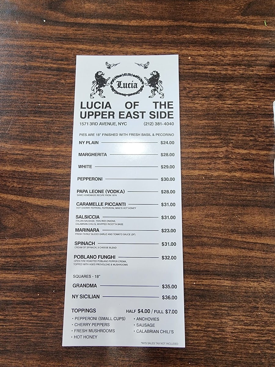 From the Cream Of Spinach Pizza Pie to flavorsome sides like Caesar Salad, every bite at Lucia reflects a commitment to quality and tradition.